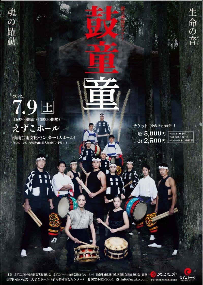 太鼓を中心とした伝統的な音楽芸能に無限の可能性を見いだし、現代への再創造を試みる集団。「鼓童」とは、人間にとって基本的なリズムである心臓の鼓動から音(おん)をとった名前で、大太鼓の響きが母親の胎内で聞いた最初の音(心音)を想起させることによるものです。そして「童(わらべ)」の文字には、子どものように何ものにもとらわれることなく無心に太鼓を叩いていきたいという願いが込められています。
