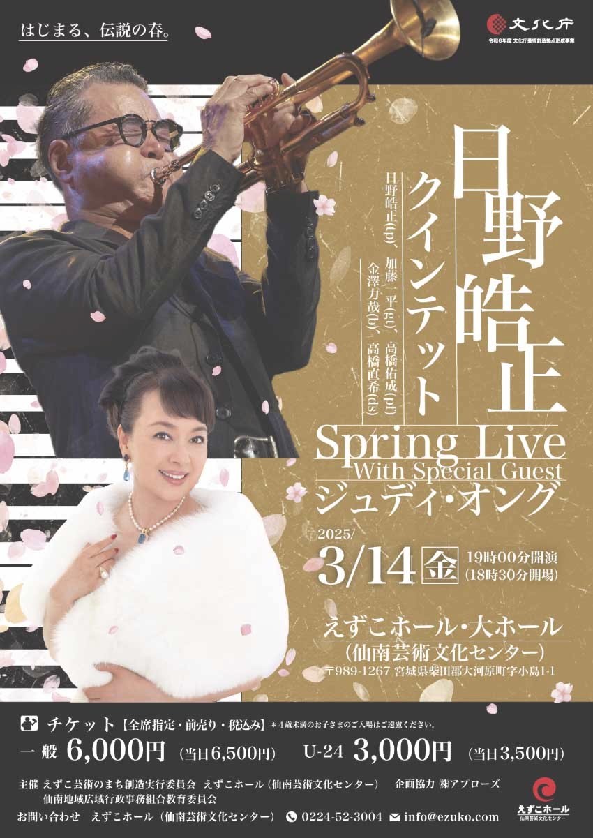 当初8/7開催としていた公演が、中止となりましたが、ホストアーティストの日野皓正氏の復調により、調整を図り、2025/3/14に再招聘が可能となったことから、改めて、新たに公演開催が決定ましたので、ご報告いたします。
