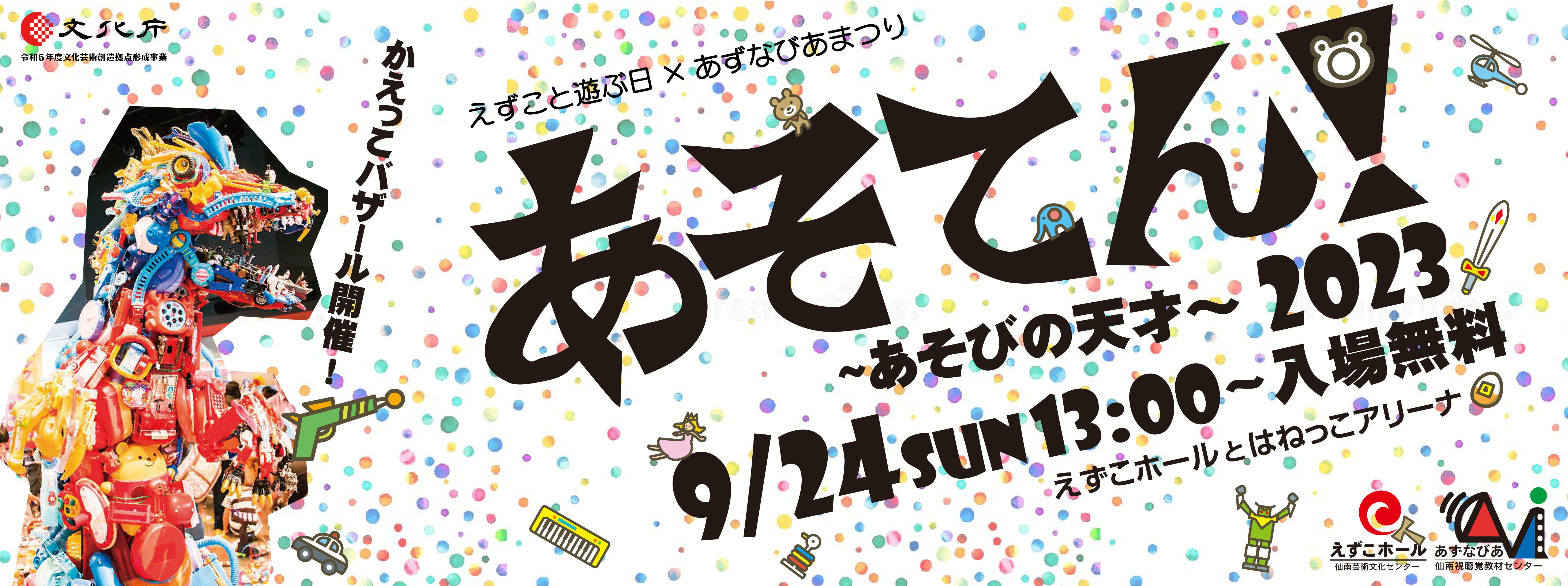 今年は、かえっこバザール(おもちゃの交換プログラム=かえっこ)が帰ってくる!かえっこを使って、劇場がまるごと遊びの空間に変わるスペシャルな1日です。普段足を運ぶことの少ない子供たちを対象に地域の団体や人たちが楽しく交流し、遊んで学べる楽しい1日をお届けします。