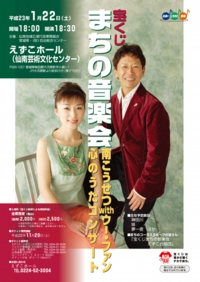 宝くじ支援事業、まちの音楽会。おなじみ南こうせつと中国古箏奏者のウー・ファンによるコンサート。楽しいおしゃべりと誰もが知っている大ヒット曲ほかウー・ファンによる伝統曲の演奏など幅の広い内容で満席の観客を楽しませた。コンサート終盤には、仙南圏域を中心に公募した合唱参加者50名(えずこ合唱団さくら)が共演し、コンサートは大いに盛り上がった。