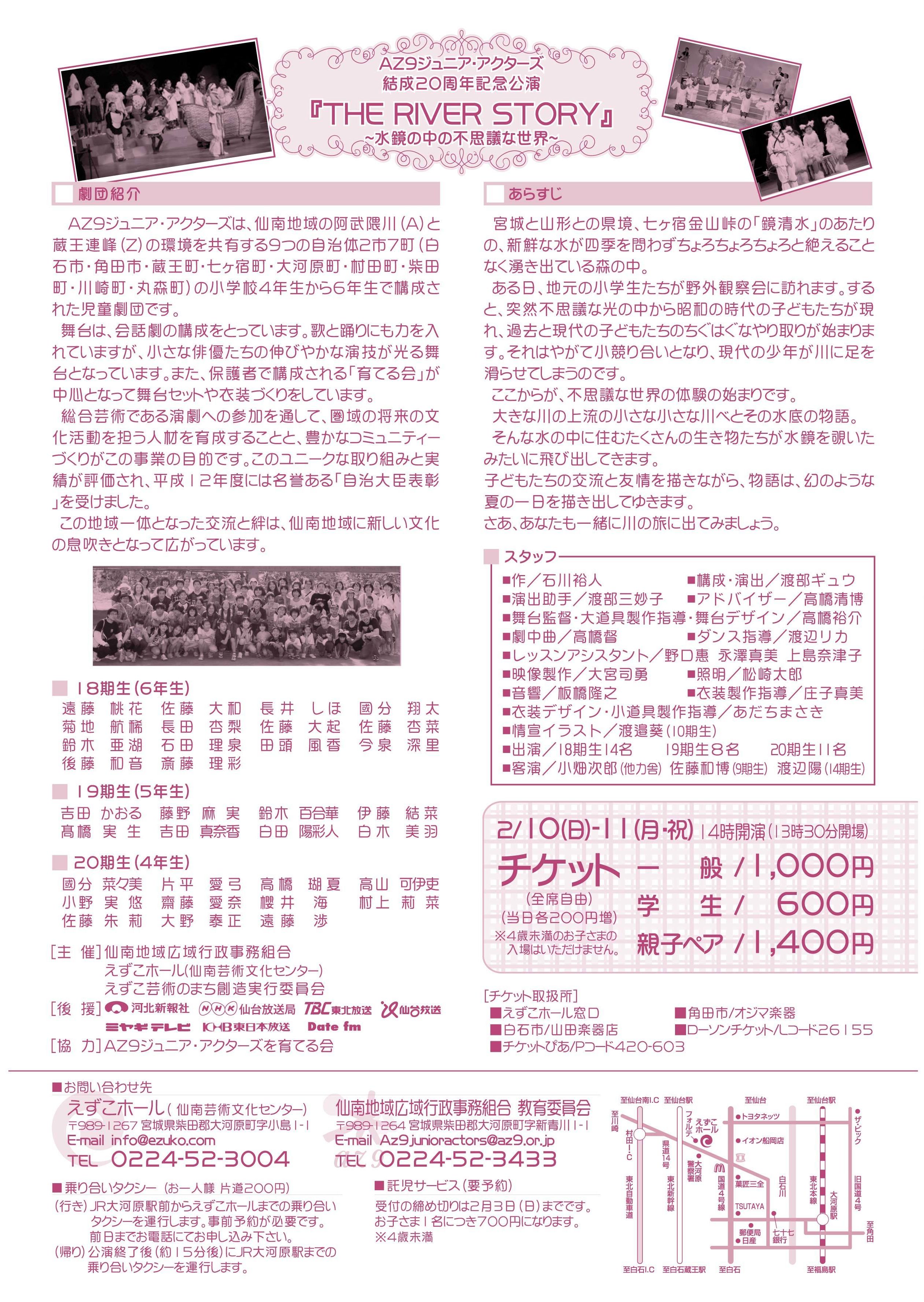 小学4~6年生が参加している。1996年以降はえずこホールを拠点に演劇公演を行う一方、これまで、白石、角田、蔵王、川崎、七ヶ宿町での地域公演を行うなど、地域との絆、繋がりを意識した事業を展開。卒業生(OB、OG)やAZ9を育てる会(親の会)との人的ネットワークを広げながら、今年、結成20周年という節目の公演を迎える。2000年にはそれまでの実績が認められ、「自治大臣賞」を受賞している。