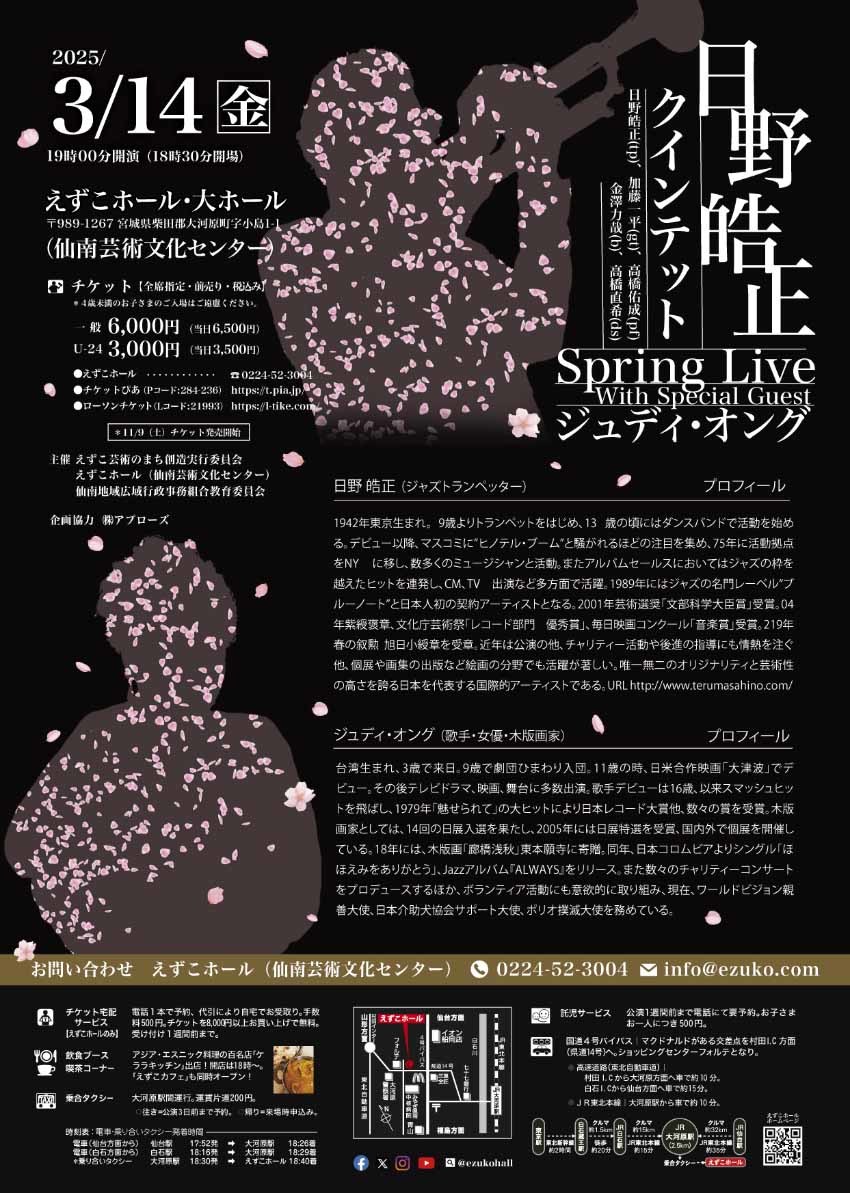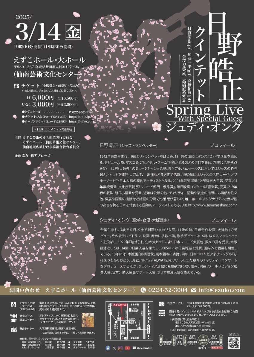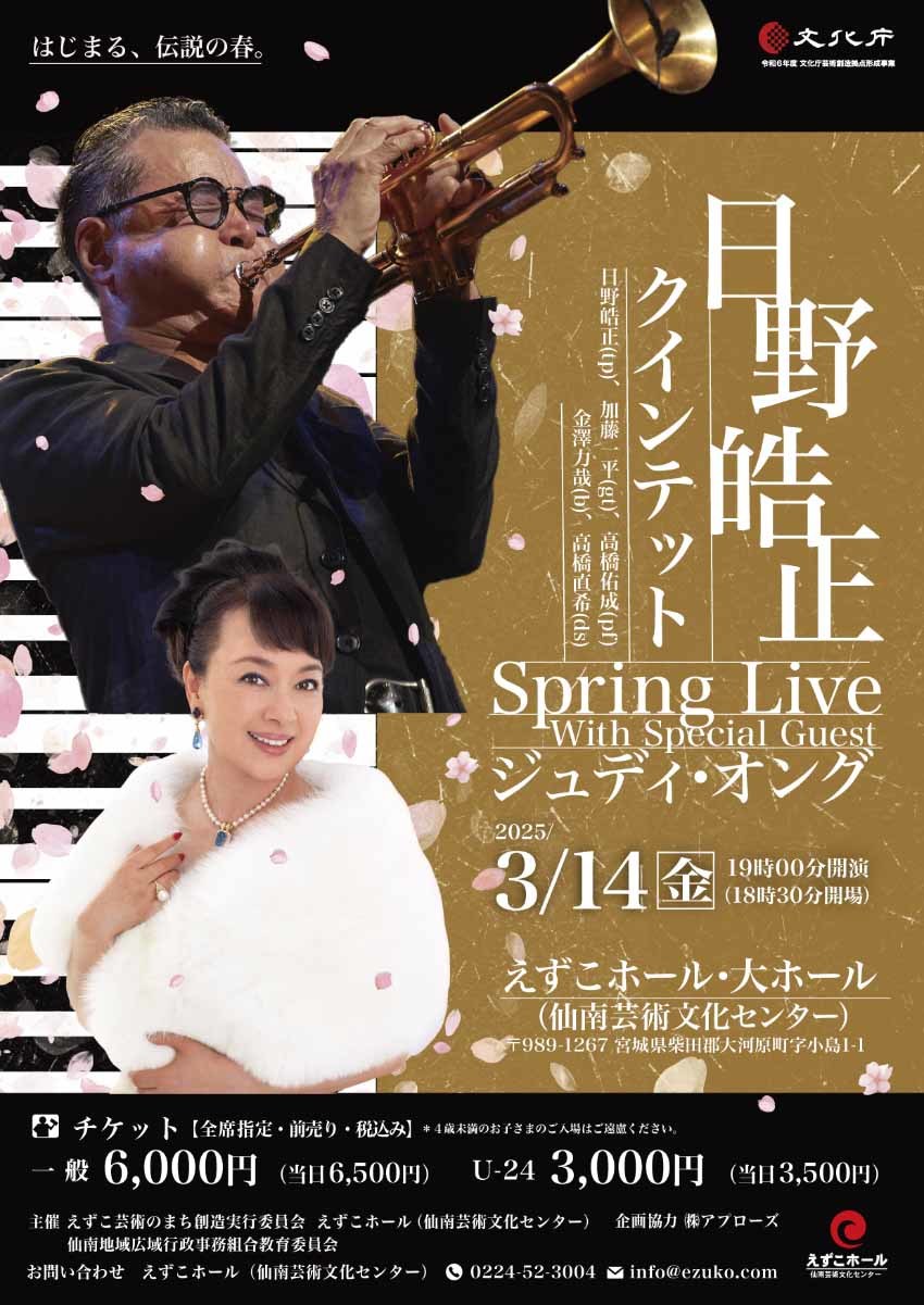 当初8/7開催としていた公演が、中止となりましたが、ホストアーティストの日野皓正氏の復調により、調整を図り、2025/3/14に再招聘が可能となったことから、改めて、新たに公演開催が決定ましたので、ご報告いたします。