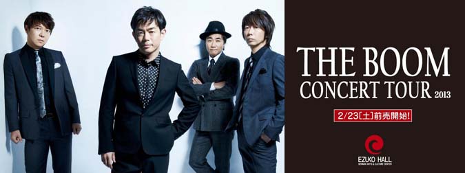 1989年にアルバム『A Peacetime Boom』でデビュー。メンバーは、宮沢和史(Vo)、小林孝至(Gtr)、山川浩正(Bs)、栃木孝夫(Drs)。93 年、大ヒットとなった「島唄」が150万枚を超えるセールスを記録。その後も世界各国でカバーされ広がりを続けている。中でも、2001年には、アルゼンチンでアルフレッド・カセーロによる「SHIMAUTA」が同国のグラミー賞にあたる「ガルデル音楽賞」を受賞。02年のサッカー・ワールドカップで代表チームの公式サポートソングとなった。05年以降活動を休止を経て、08 年、日本人ブラジル移民100 周年を記念して横浜で開催されたフリーライブ「10,000 SAMBA !」のステージで2 万人を動員し復活を果たす。その年、「宮沢和史 in ガンガ・ズンバ&ザ・ブーム」としてNHK 紅白歌合戦にも出場。09 年は、デビュー20 周年を迎え、コンサートツアーや夏フェスへの出演、アルバム『四重奏』のリリースなど、精力的な活動を行なった。10年には、『THE BOOM Special Best Live Tour 2010 BOOMANIA』と題し、野外ライブを中心とした全国ツアーを展開。各会場に異なる全11組のミュージシャン(MINMI&PETER MAN、MCU、ユウ(GO!GO! 7188)、キマグレン、小田和正、友部正人、MONGOL800、矢野顕子、秦基博、おおはた雄一、仲井戸麗市)をゲストに招き、スペシャルなライブツアーを展開。世代やジャンルを越えた多彩なラインアップで夢の共演を実現させた。2011年、石川さゆりをゲストボーカルに迎え、シングル「暁月夜 ~あかつきづくよ~ feat. 石川さゆり」をリリース。同年、待望のニューアルバム『よっちゃばれ』をリリース。(「よっちゃばれ」とは、故郷・山梨の言葉で「寄っておいで、集まっておいで」を意味)さらに“THE BOOM 歳末御礼公演 『平成よっちゃばれ!』” を横浜、東京、大阪にて開催した。2014 年に迎えるデビュー25 周年を目前に、新たな旅をスタートさせる。 【公式サイト http://www.theboom.jp/】