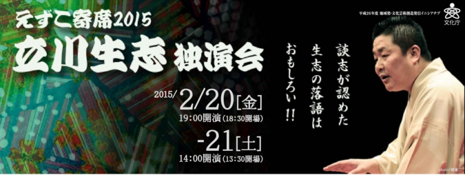 くせ者揃いの立川一門にあって、噺に芯を通す表現力と、さらっと現代感覚を織り交ぜる繊細さ、伝統と現代性を絶妙に描く噺家、立川生志。古典落語を陽気に演じて観客を巻き込む実力派。心温まるえずこ寄席たっぷりおたのしみください。