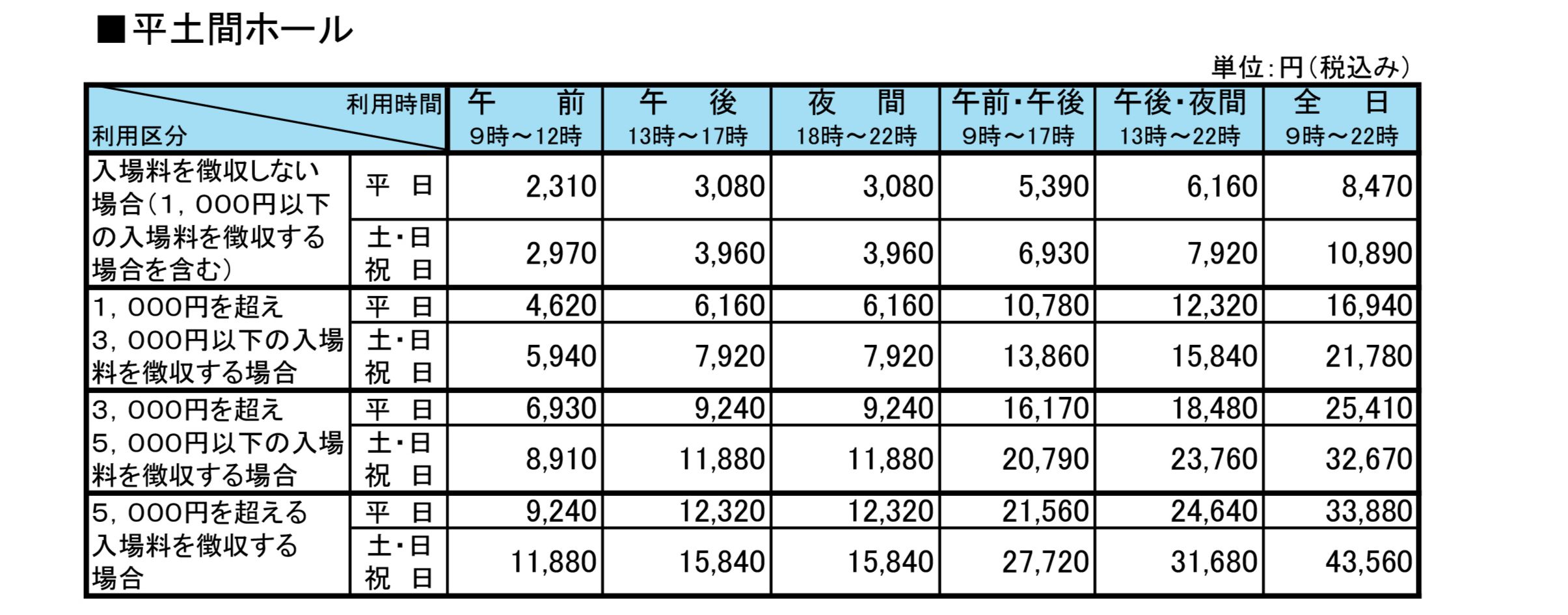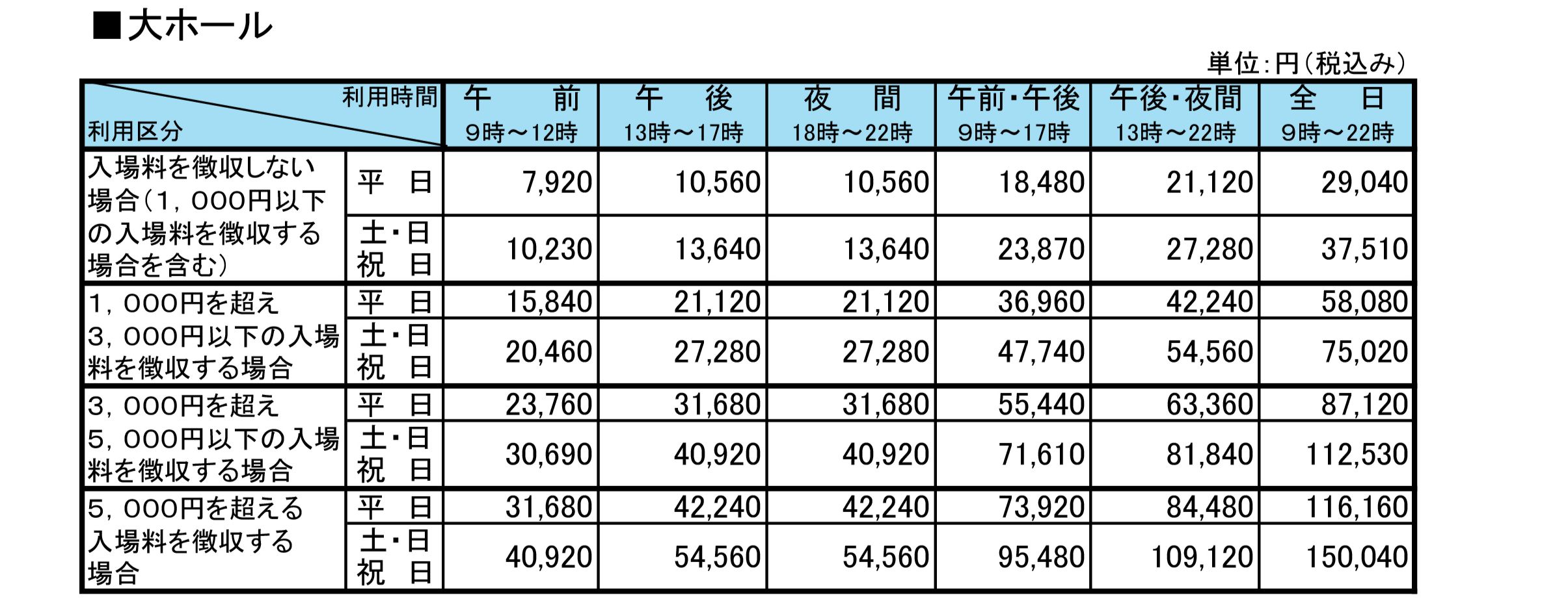 ●大ホール、平土間ホールを利用する場合において、営利を目的とする場合には、利用料金は最高金額で算出します。