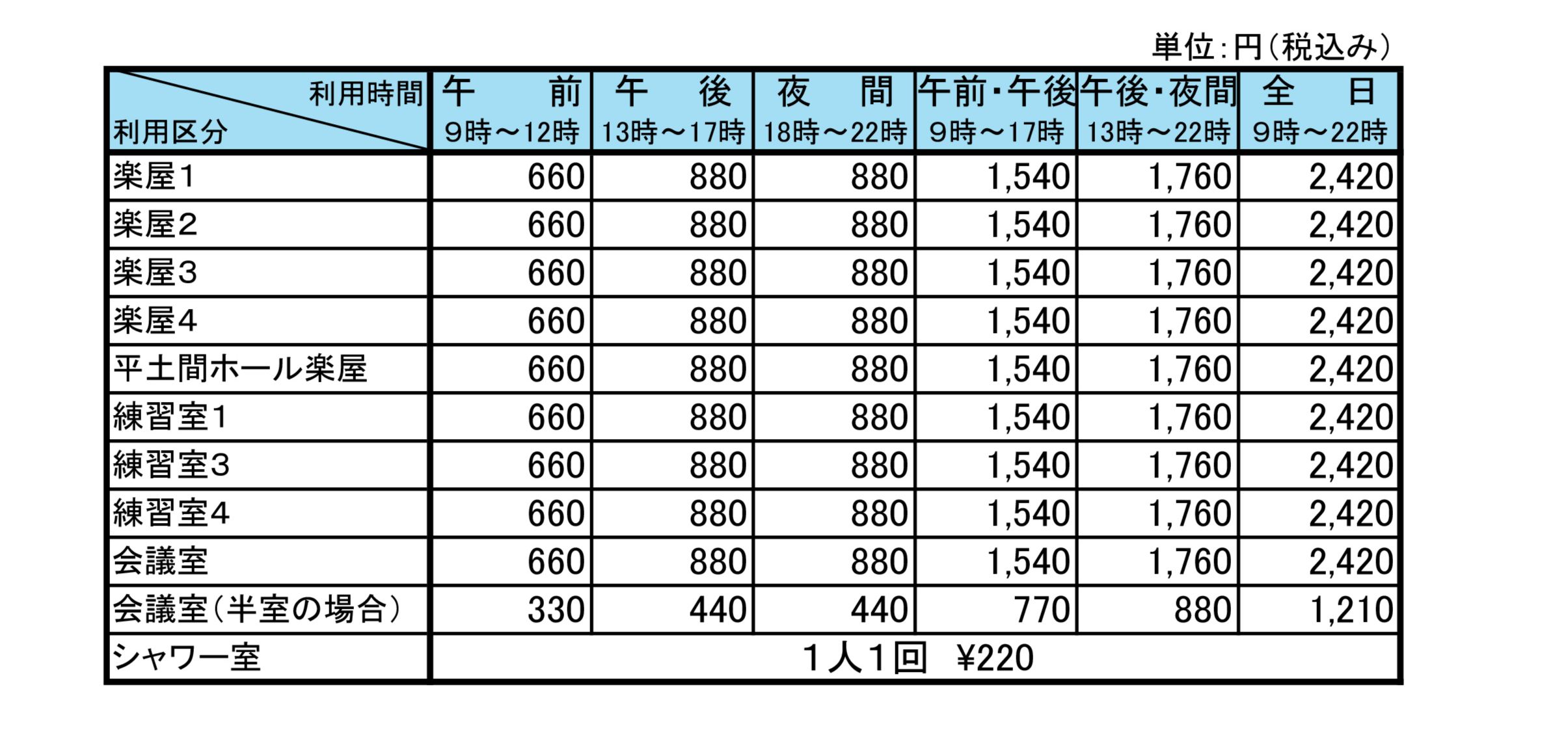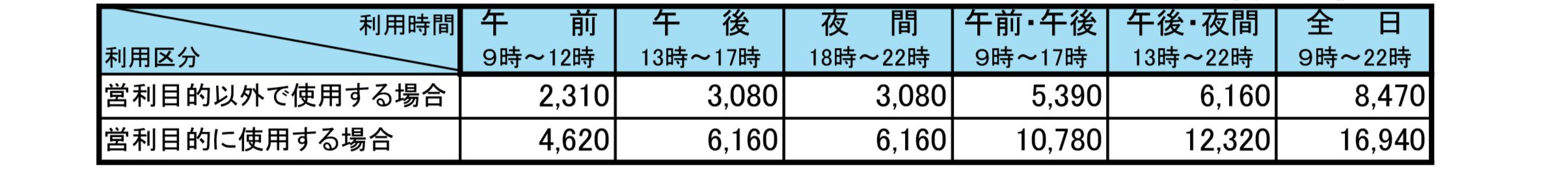 リハーサルのために利用する場合の利用料金は前記表の2分の1になります。